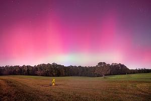 Northern Lights over countryside in the foothills of North Carolina two weeks after Hurricane Helene.
