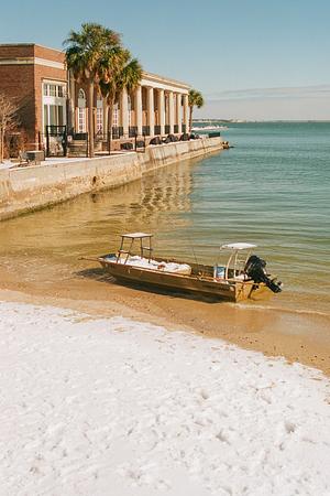 A beached skiff in Charleston Harbor on a snow day.